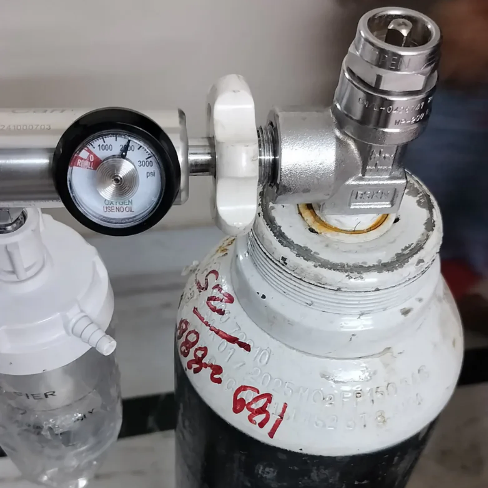 1.4 m³ mild steel oxygen cylinder (Bullnose cap regulator) for home oxygen therapy in Kolkata.